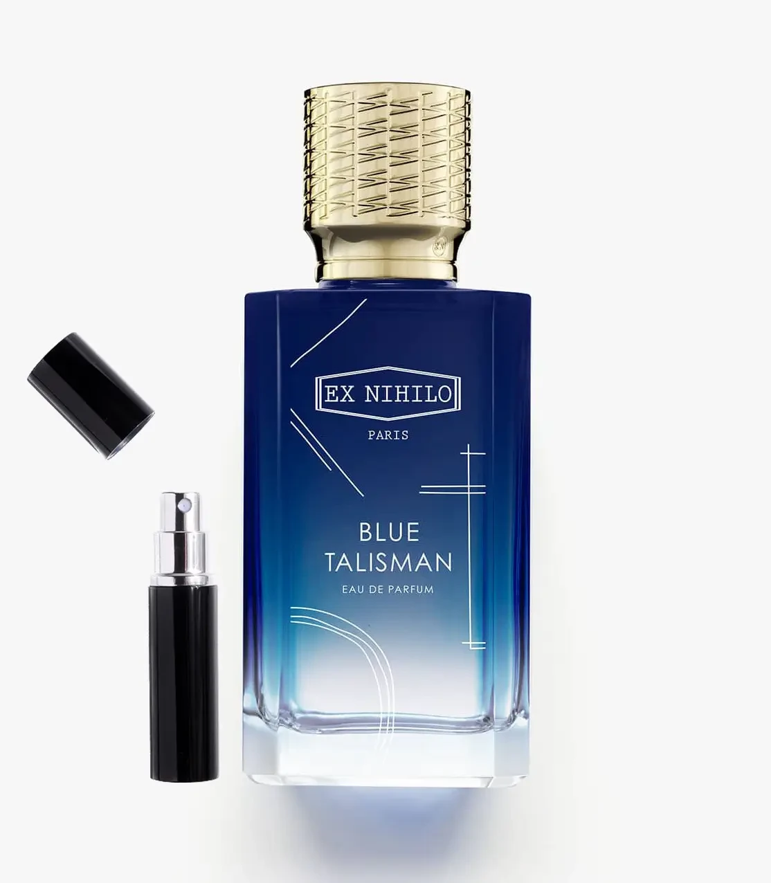 Ex Nihilo Blue Talisman - оригінальний парфумерний бренд із Франції Ex Nihilo був створений у 2013 році трьома підприємцями Сільвією Лоде, Олів'є Ройє та Бенуа Вердьє. Друзі поєднали свої знання та вміння, щоб займатися творчою роботою та дивувати людей сучасними якісними ароматами. Назва компанії перекладається з латині у вигляді вислову «З нічого». Почавши практично з нуля, за 10 років діяльності бренд досяг успіху, його продукція користується попитом, а найпрестижніші універмаги прагнуть відкрити бутики Ex Nihilo. На даний момент торгова марка може запропонувати понад 60 чудових ароматів, створених у результаті синтезу натуральних інгредієнтів та синтетичних молекул. Парфумерна вода Ex Nihilo Blue Talisman (Синій талісман) вийшла 2023 року до 10-річного ювілею бренду. Як і більшість фірмових ароматів, новинка виконана у гендерно-нейтральному стилі. Розкішна композиція нагадує дорогоцінний камінь, вона запрошує всіх бажаючих у світ елегантності та загадковості. Верхні ноти аромату сяють фруктовими гранями соковитої груші, свіжого бергамоту та яскравого мандарину, приправленими елітною терпкістю імбиру. Середня частина ольфакторной піраміди розкривається вишуканістю та ніжністю флердоранжу разом з деревно-амбровими відтінками молекули Georgywood. У базових нотах звучать мускус, стійкий амбровий акорд Ambrofix та свіжі деревні тони акігалавуда. Композиція має глибину і насиченість, вона залишає елегантний стійкий шлейф.
